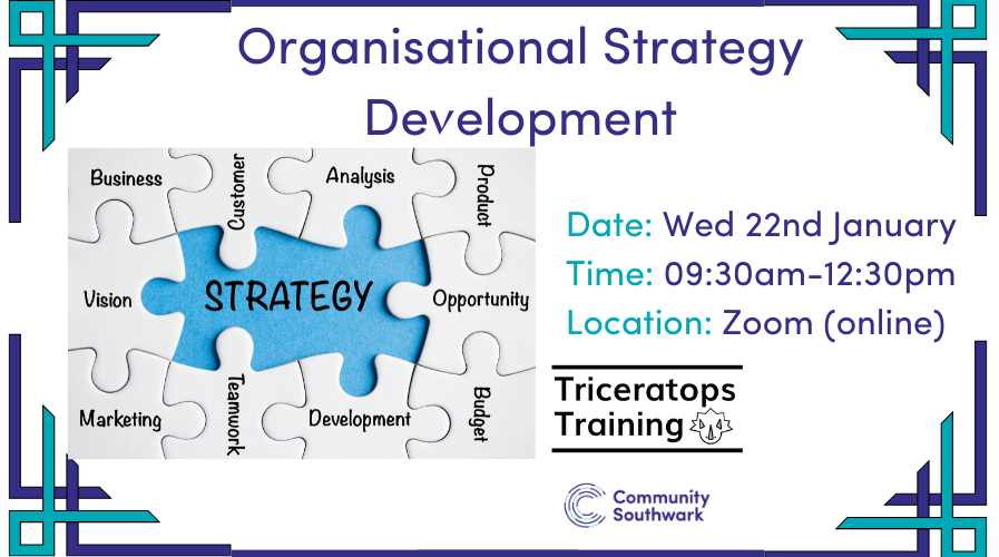 Community Southwark has commissioned Triceratops to provide a half-day workshop on developing a strategy for your organisation. Places are limited – please ensure you cancel your ticket if you can no longer attend (for Community Southwark members only).